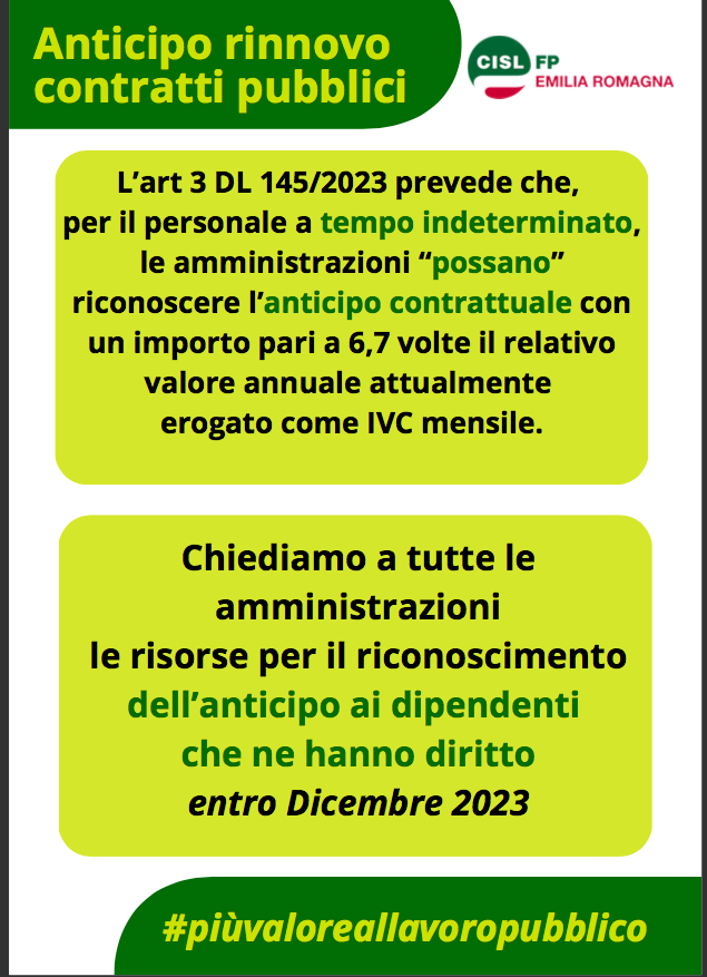 (Bologna, 24 ottobre 2023) Con l’entrata in vigore, il 18 ottobre scorso, del cosiddetto “Decreto anticipi n. 145/2023”, è previsto il riconoscimento anticipato dei futuri aumenti contrattuali, per il mese di dicembre 2023, a valere sull’anno 2024.Uno stanziamento pari a 2 miliardi di euro, per il riconoscimento dell’indennità di vacanza contrattuale spettante al personale a tempo indeterminato delle Amministrazioni statali, e da riconoscersi auspicabilmente, già nella busta paga di novembre o al massimo di dicembre.